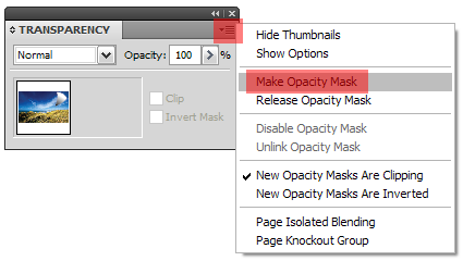 After you have both of these selected, go to your transparency palette and select “make opacity mask” from the fly out as shown below.